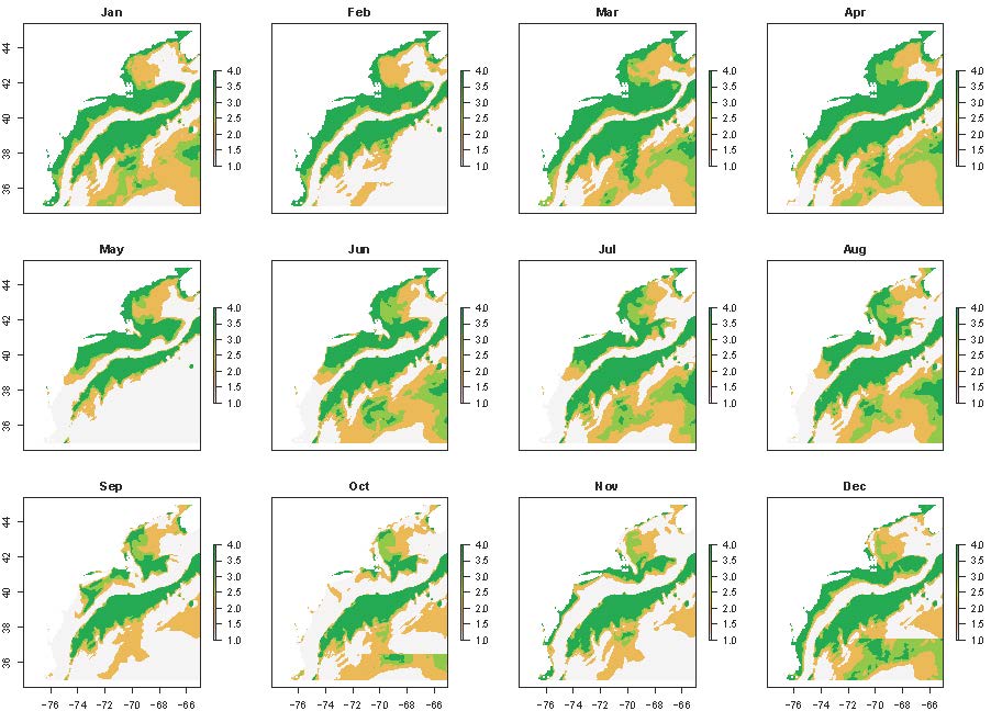vecExp <- makeExposureTimeseries(rankExp = expRanked, sdmRast = avgHSM)The ensemble SDM results produced by make_predictions should be converted into a monthly average prior to using makeExposureTimeseries and makeExposureMaps. It is also recommended that you remove low SDM values after averaging. In the NE Shelf CVA2.0, we removed all SDM values less than 0.1 (representing areas with less than a 10% likelihood of finding the species). Not removing these low values resulted in higher than expected exposure results in areas where the species is rare.