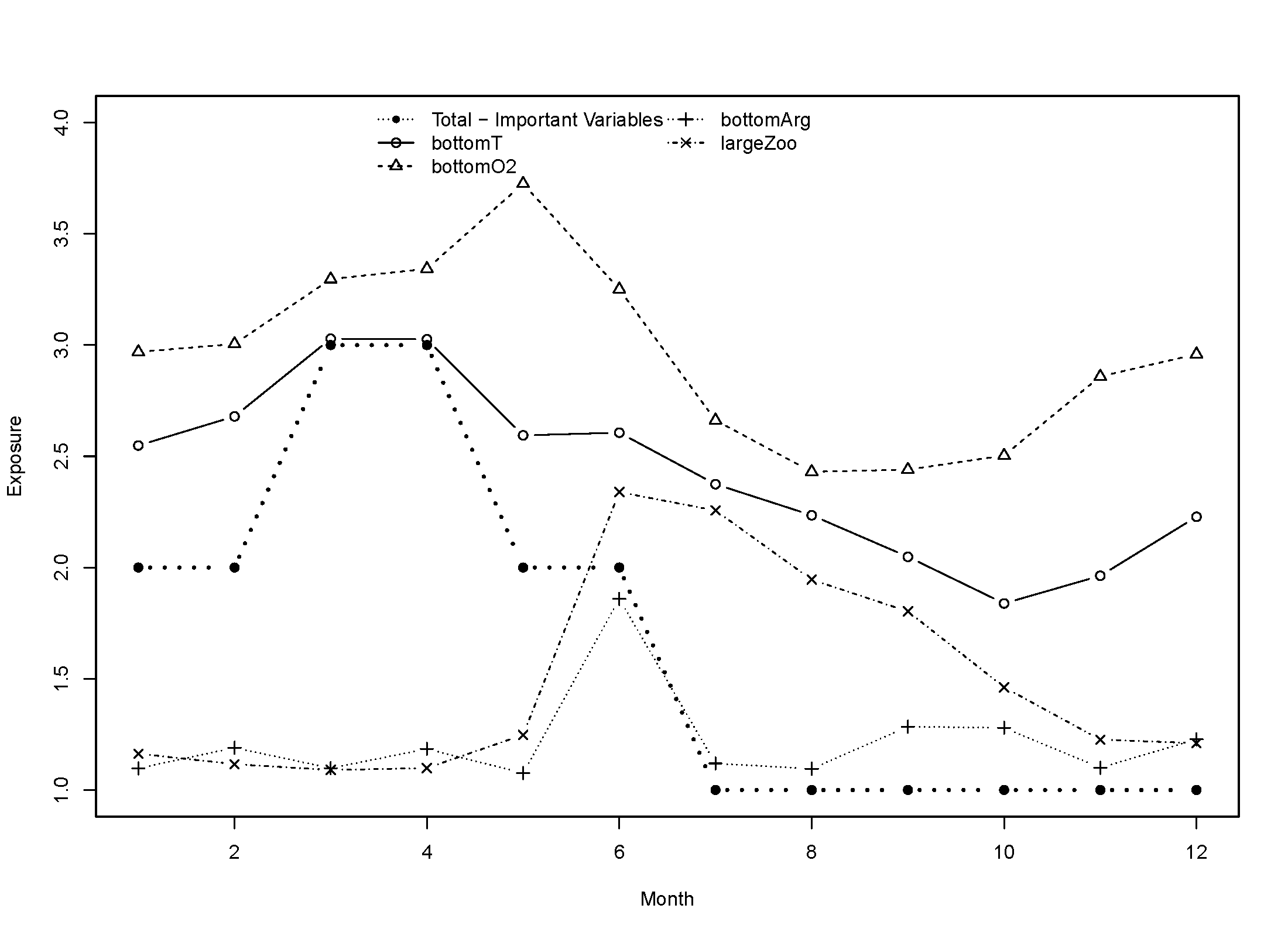 The output from makeExposureTimeseries is a matrix with 12 columns (1 for each month) and a number of rows equal to the number of environmental variables in expRanked. makeExposureMaps produces a rasterStack, with each layer representing one of the environmental variables. Values should range from 1 to 4.