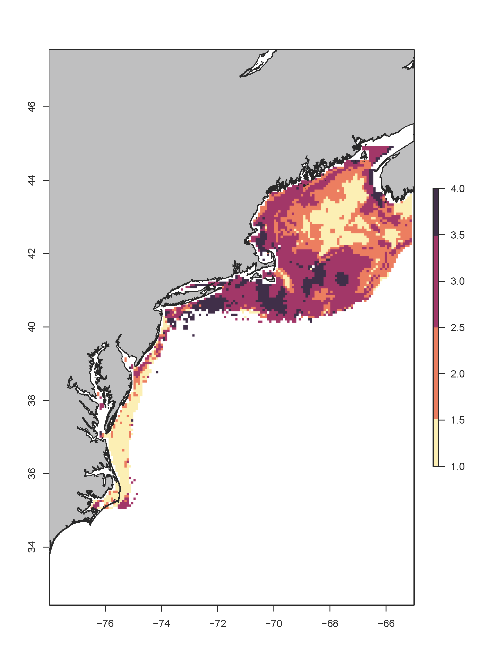 totalMS <- combineMaps(mapExp = mapSub, weights = cW, wThreshold = 0.1, countAll = F)Below are examples of total exposure using both methods for Atlantic cod: