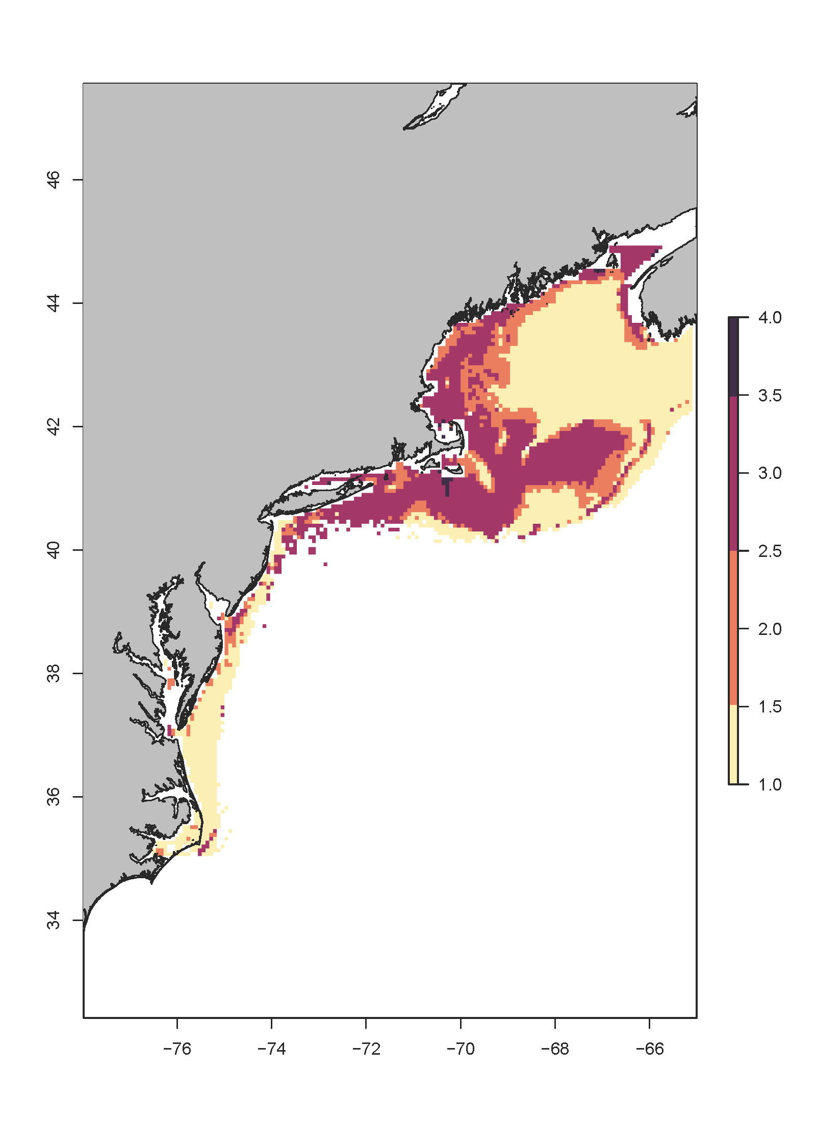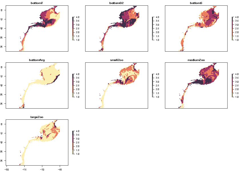 Where presentRasts and futureRasts are lists of rasterStacks with the same length. These are the raw timeseries over the desired time periods. Remember that pull_hind and pull_forecast pull the complete timeseries for the desired MOM6 run, so you will need to subset their outputs accordingly if desired. calcExposure will produce a list of rasterStacks with the same length as the provided lists. Each rasterStack will have 12 layers, one for each month.