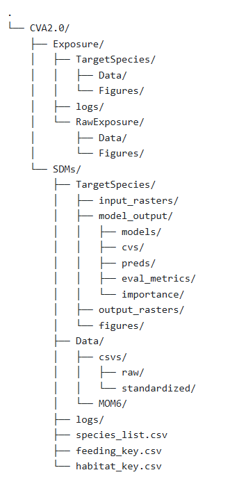 Within the SDM directory, the Data subdirectory should have subfolders for csv and MOM6 (or other environmental) data, as well as an object containing a list of static environmental covariates (bathymetry, distance to shore, etc). The CSV folder should contain raw and standardized subfolders to hold the raw csv files from different data sources, and their standardized counterparts from the standardize_data function. The MOM6 data should contain the raw, averaged, standard deviation, and normalized outputs from the MOM6 functions. Each species folder should contain three subfolders: 1) input_rasters, 2) model_output, and 3) output_rasters. The input_rasters folder contains all the individual rasters from each data source and the combined raster. The output_rasters folder contains all the predicted rasters from each model and the final ensemble model. The model_output folder contains the following folders: 1) models, 2) cvs, 3) preds, 4) eval_metrics, and 5) importance. Each of these folders will contain the output from their respective functions for each model component, and as necessary, the ensemble model.